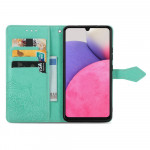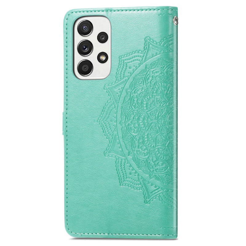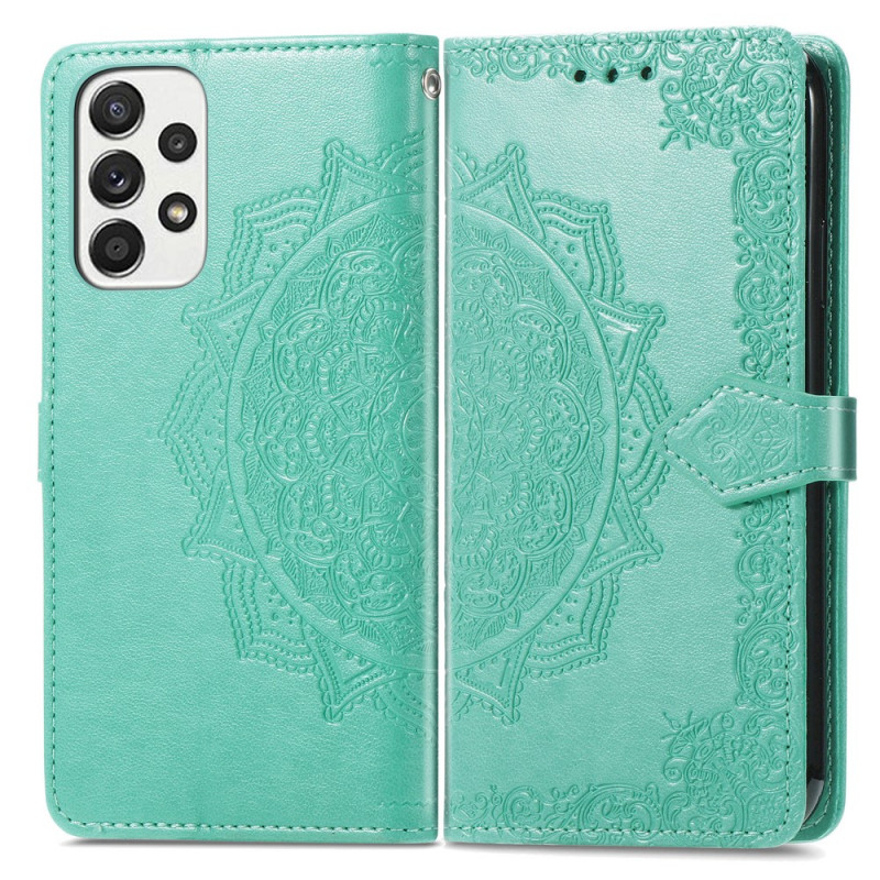 Eine wunderschöne Hülle für das Samsung Galaxy A13, die mit einem mittelalterlichen Mandala verziert ist, es vollständig sichert und gleichzeitig als Brieftasche dient.
