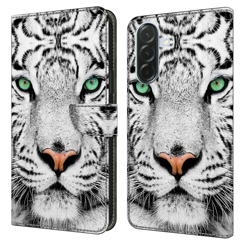 Schützen Sie Ihr Samsung Galaxy A57 5G stilvoll mit diesem Klappetui mit markantem Tigermuster. Mit integrierten Kartenhaltern und einem Fach für Geldscheine vereint es Funktionalität und Eleganz. Klappbare Halterung für optimalen Komfort.