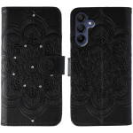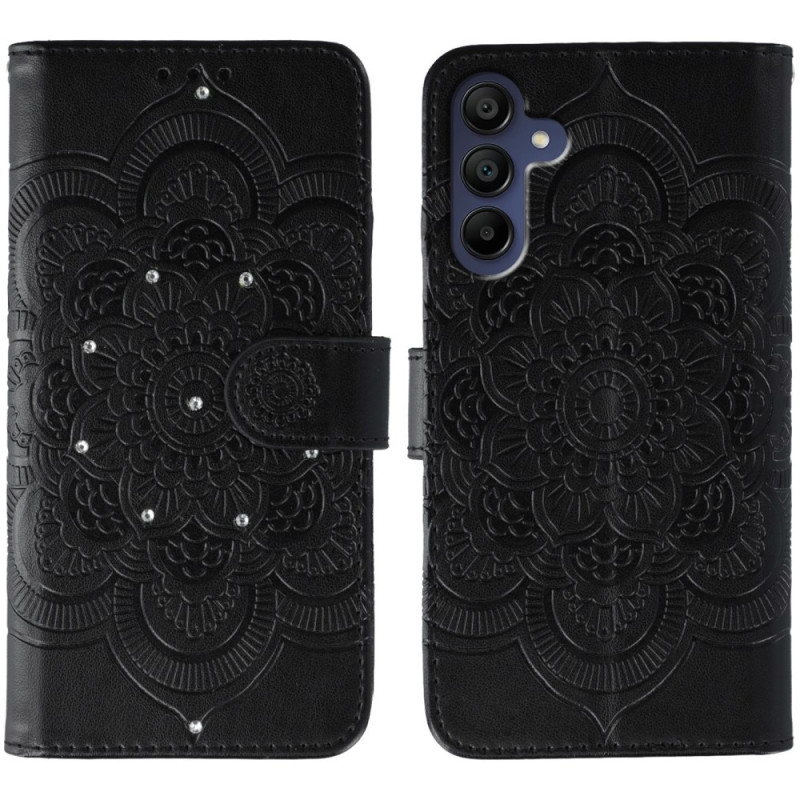 Schützen Sie Ihr Samsung Galaxy A57 5G elegant mit dieser Klapphülle, die mit einem wunderschönen Mandala-Muster und glitzernden Strasssteinen verziert ist. Profitieren Sie von den praktischen Funktionen: integrierter Kartenhalter, abnehmbare Handschlaufe und Viewing Stand.