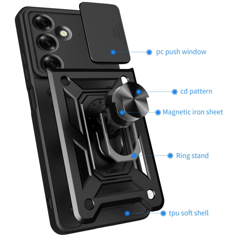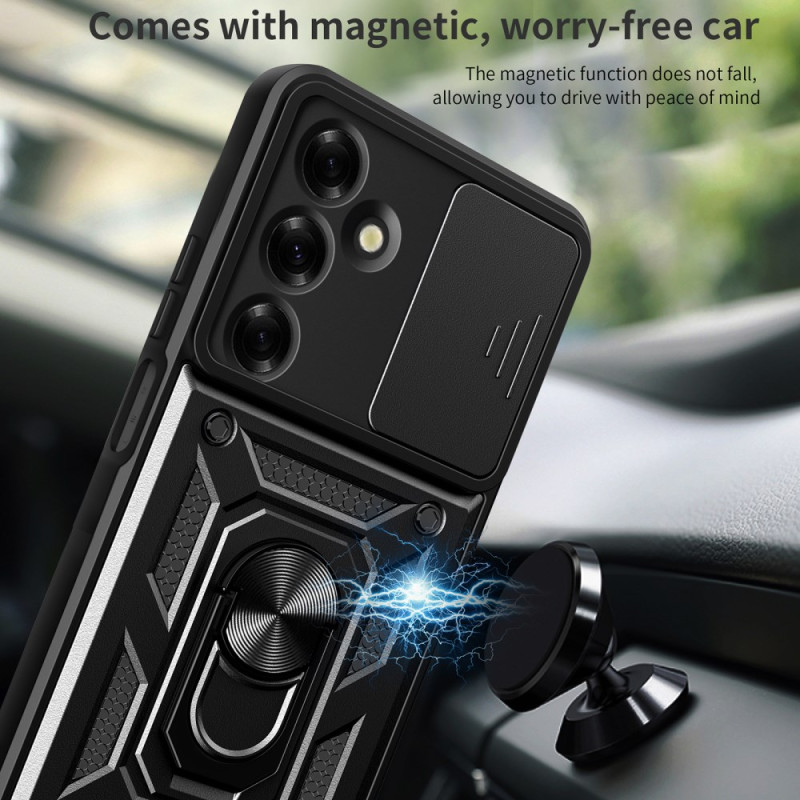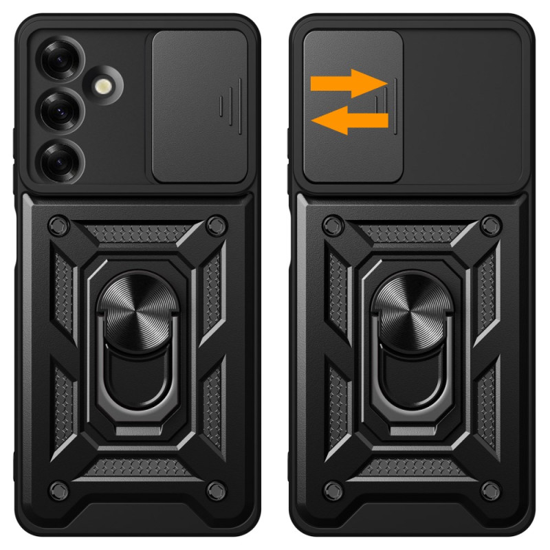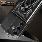 Entdecken Sie unsere innovative Schutzhülle für das Samsung Galaxy M35 5G. Ausgestattet mit einem Schiebedeckel für die Kamera und einer drehbaren Halterung bietet sie Schutz in Militärqualität.