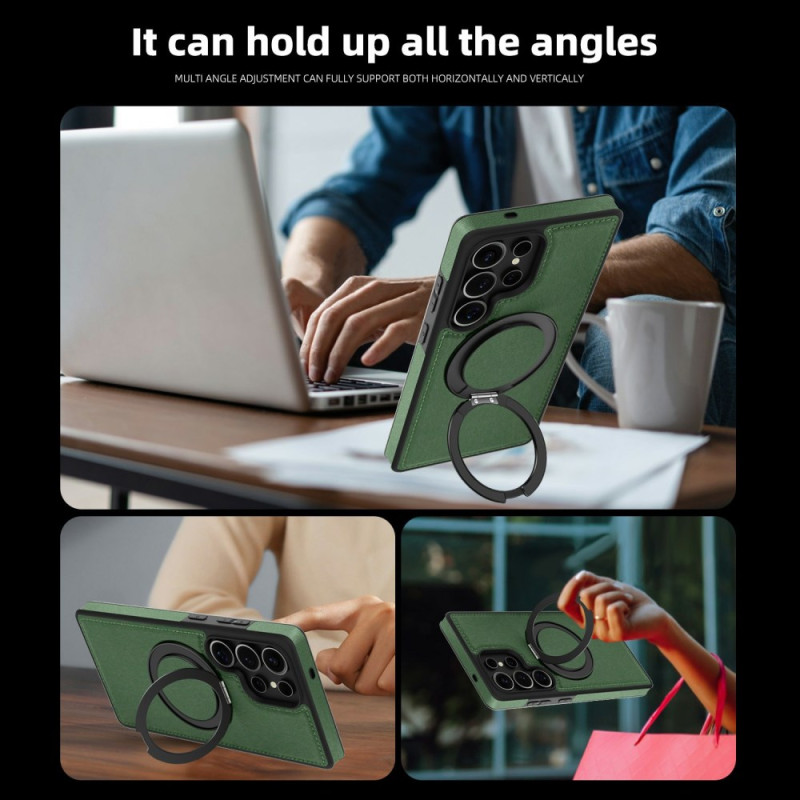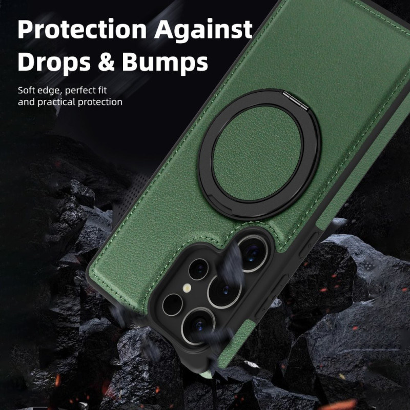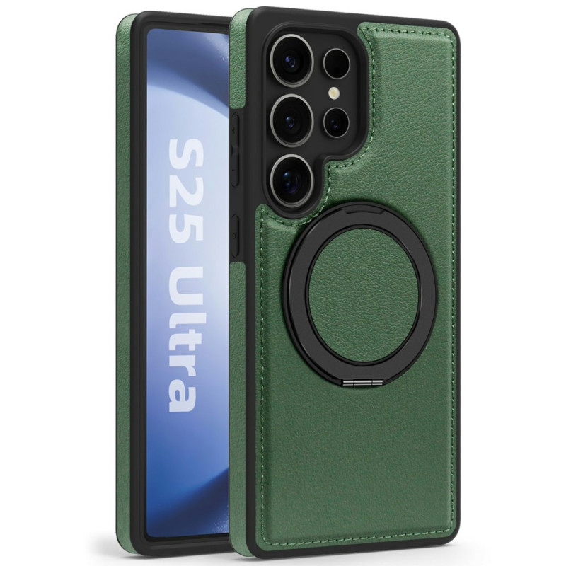 Entdecken Sie unsere innovative magnetische Hülle für das Samsung Galaxy S25 Ultra. Sie verfügt über einen um 360° drehbaren Ring und bietet dank ihrer Kombination aus TPU, PC und PU-Leder einen robusten Schutz.