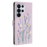 Schützen Sie Ihr Samsung Galaxy S26 Ultra elegant mit diesem Portemonnaie-Etui aus lavendelfarbenem Kunstleder. Raffiniertes Design mit aufgedruckten Motiven, stoßfeste TPU-Hülle, verstellbarer Ständer und abnehmbare Handschlaufe für den praktischen täglichen Gebrauch.