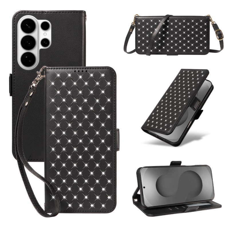 Étui élégant pour Samsung Galaxy S26 Ultra alliant luxe et praticité. Décoré de strass avec motif losange, il dispose de 3 emplacements pour cartes, d'une poche pour billets et d'une protection RFID. Le rabat magnétique se transforme en support.