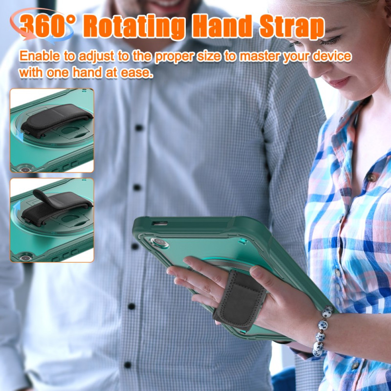 Diese Hülle für das Samsung Galaxy Tab A9 Tablet ist mit einem um 360 Grad drehbaren Ständer und einem Handriemen ausgestattet.