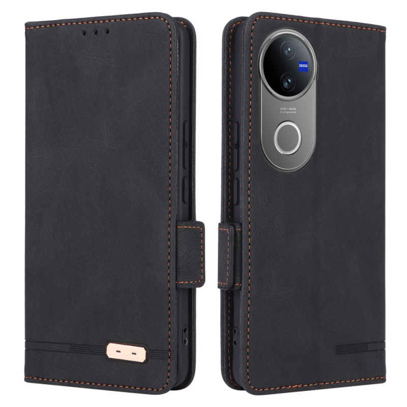 Schützen Sie Ihr Vivo V50 5G elegant mit dieser multifunktionalen Brieftasche. Sie verfügt über ein raffiniertes Design mit Metallverzierung und kombiniert robusten Schutz mit praktischen Funktionen wie Kartenfächern und einem integrierten Halter.