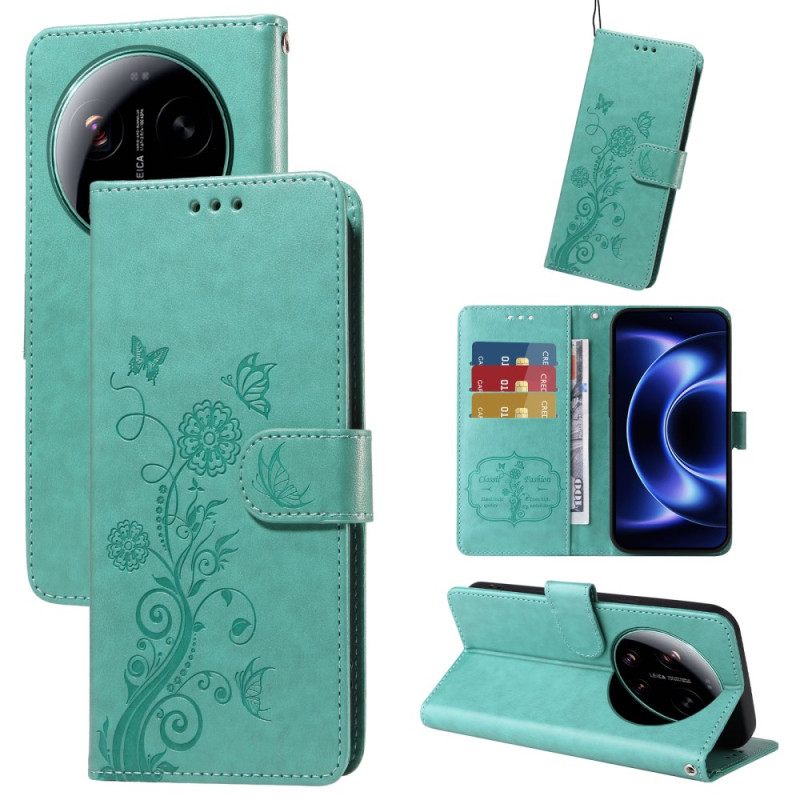 Entdecken Sie diese elegante Brieftasche für das Xiaomi 17 Ultra 5G. Raffiniertes Design mit geprägtem Schmetterlings- und Blumenmuster, integrierte Halterung für freihändiges Betrachten, mehrere Kartenfächer und Münzfach.