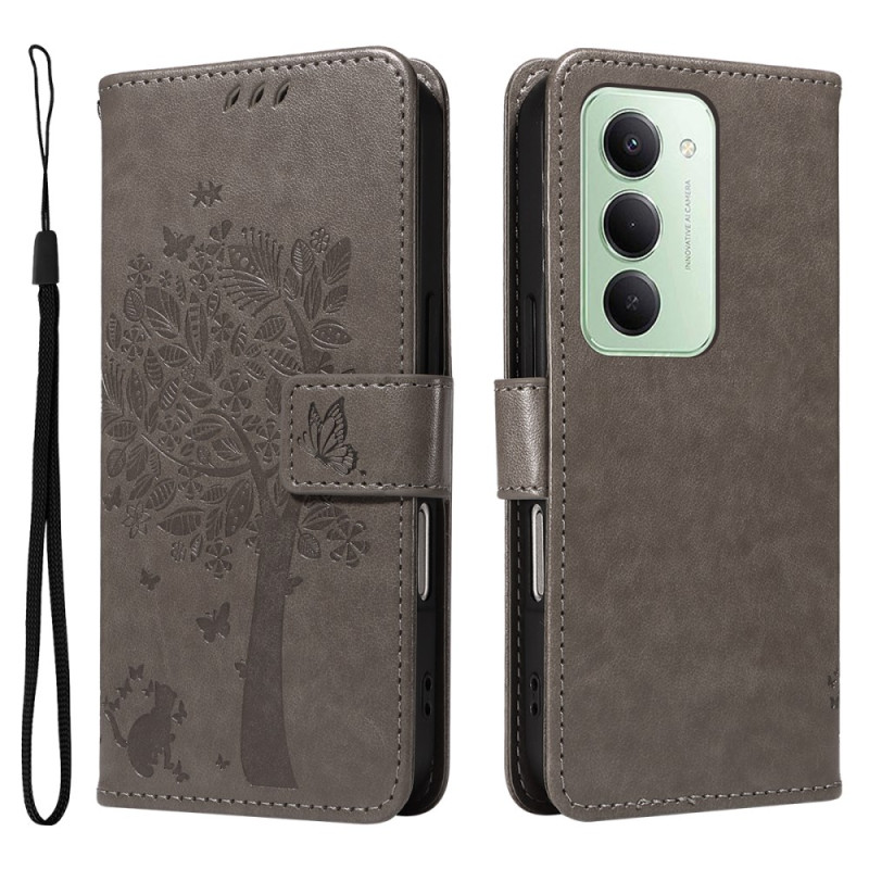 Hochwertige Brieftasche aus Leder mit Katzen- und Baummotiv für Xiaomi Redmi 15 4G (EU). Bietet einen eleganten und robusten Schutz mit praktischen Funktionen wie einem integrierten Ständer, Kartenfächern und einer Handschlaufe.