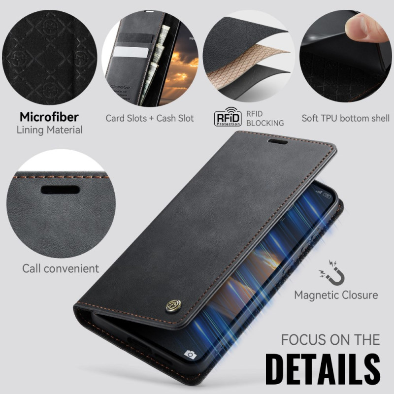 Elegantes Wallet-Etui mit integriertem RFID-Schutz, um Ihre persönlichen Daten zu sichern. Praktisches Design mit 2 Kartenfächern und einem Fach für Geldscheine. Verstellbare Standfunktion für optimales freihändiges Betrachten.