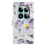 Elegante Klapphülle mit lilafarbenem Blumenmuster für das Xiaomi Redmi Note 15 Pro Plus 5G. Enthält 2 Kartenfächer, 1 Fotofach, integrierten Klappständer und abnehmbare Handschlaufe. Sicherer Magnetverschluss für optimalen Schutz.