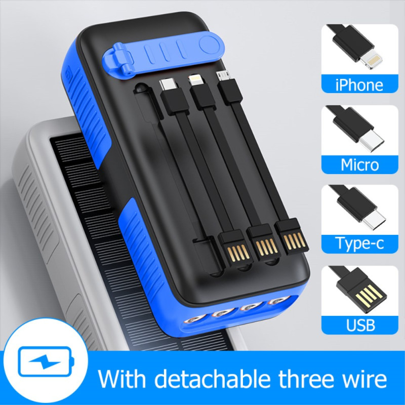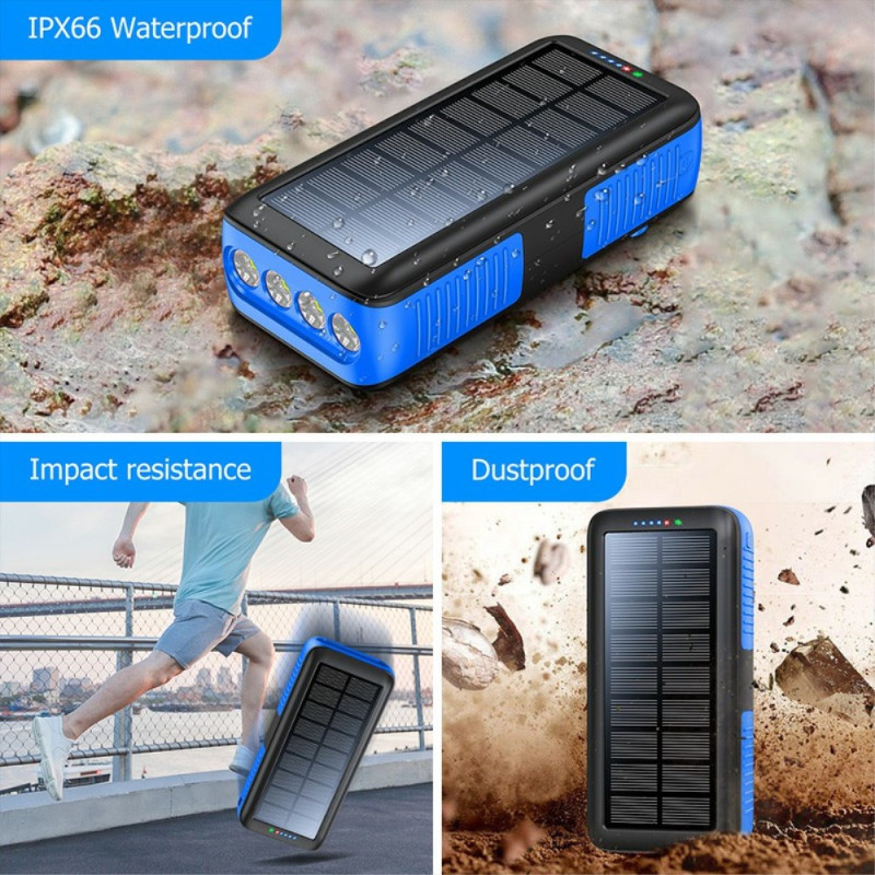 When access to electricity is not guaranteed, this External Battery becomes essential survival equipment. With a massive 30000mAh capacity, it is designed for long expeditions and emergency situations. Its unique dual recharging method - solar and crank - ensures constant autonomy, even when off-grid. With IP66 certification, it's solid, durable and resistant to water splashes and dust. For safety, it includes a powerful 4 LED torch with SOS mode. What's more, the three detachable cables (Lightning, Type-C, Micro) eliminate the need to carry extra accessories, offering maximum versatility.