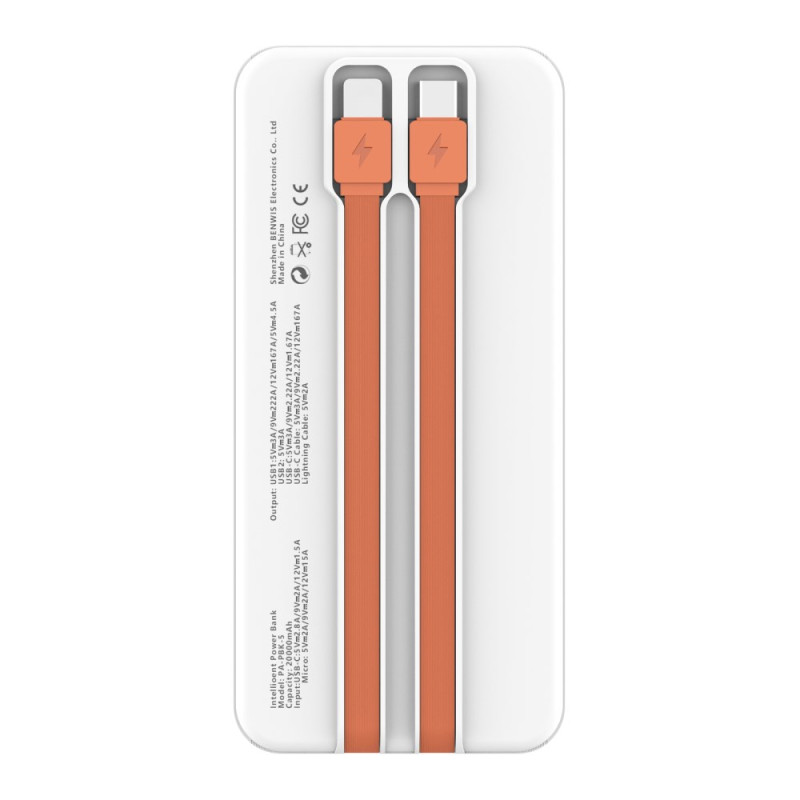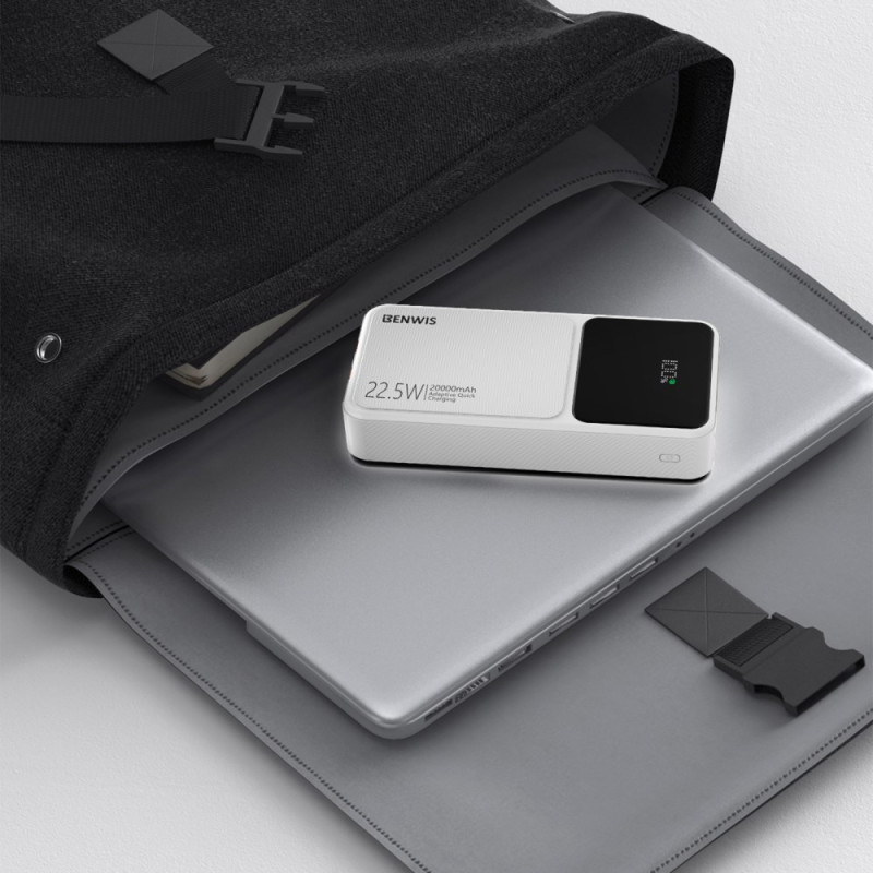 Instant access to energy for all devices is the priority of this BENWIS External Battery, designed for organisational efficiency. With a capacity of 20,000mAh, it guarantees multiple recharges. The design integrates USB-C and Lightning cables, eliminating the need to carry extra wires. Output power reaches 22.5W, ensuring fast charging via the ports and integrated Type-C cable. Its intelligent management system protects the health of connected devices. The accurate LED display keeps you informed of battery life, and the whole package complies with European safety standards.