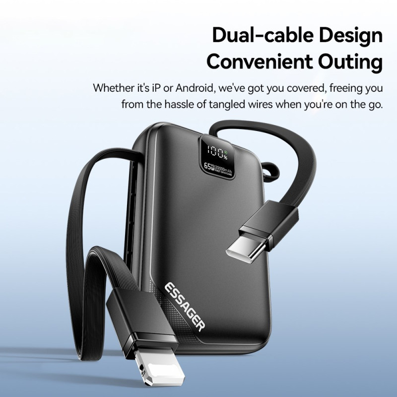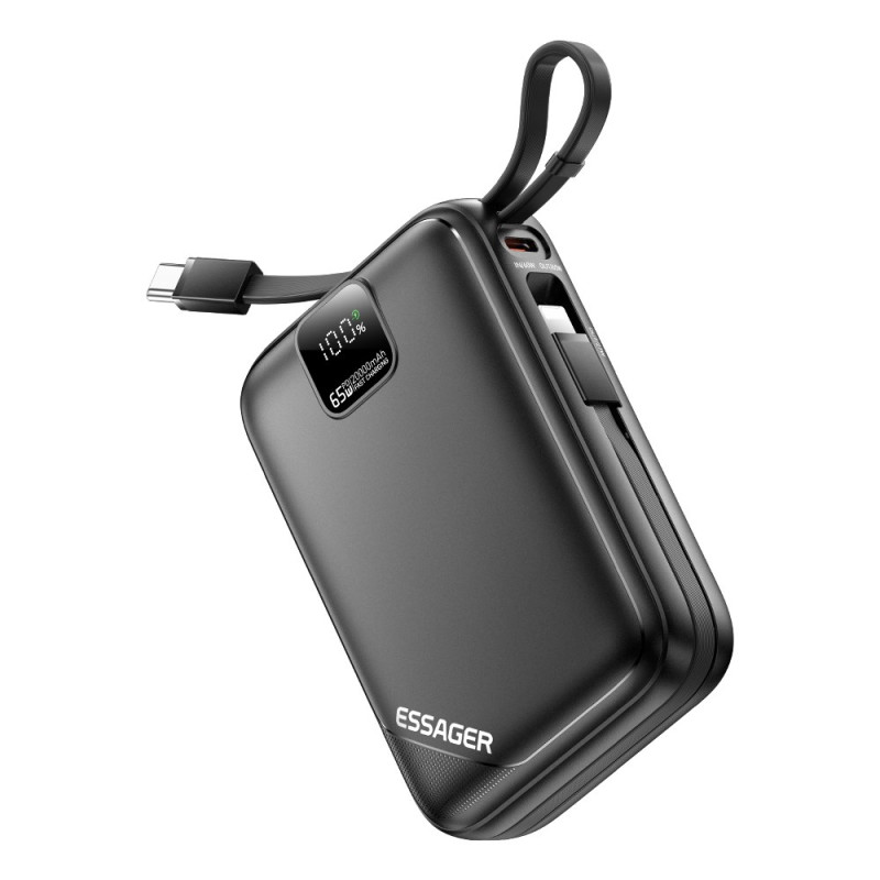 The power level required for a top-of-the-range mobile is now available, including a complete charging solution. This ESSAGER 20000mAh External Battery delivers a maximum output of 65W, ensuring fast charging of laptops, tablets and smartphones. The integration of Type-C and Lightning cables eliminates clutter, while its capacity keeps your devices powered up for days. It supports a 60W input for fast recharging of the battery itself. Its intelligent digital display lets you manage battery life precisely, and its compliance with European CE and RoHS standards is proof of its reliability.