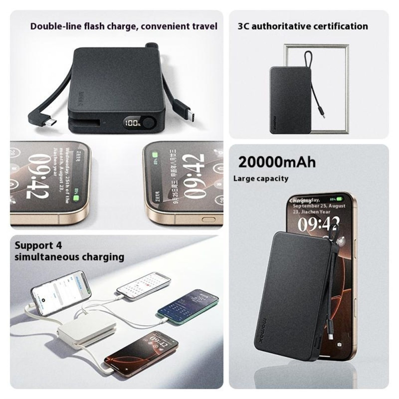 An essential productivity tool, this MOMAX External Battery is the ultimate power hub for professionals on the move. Its colossal 20,000mAh capacity guarantees extended autonomy for all your devices. It delivers a maximum charging power of 30W, ensuring ultra-fast recharging. The integration of two USB-C cables eliminates dependence on external wires, providing a complete and tidy solution. With four available outputs, it can charge up to four devices simultaneously. The PC+ABS casing ensures great durability.
