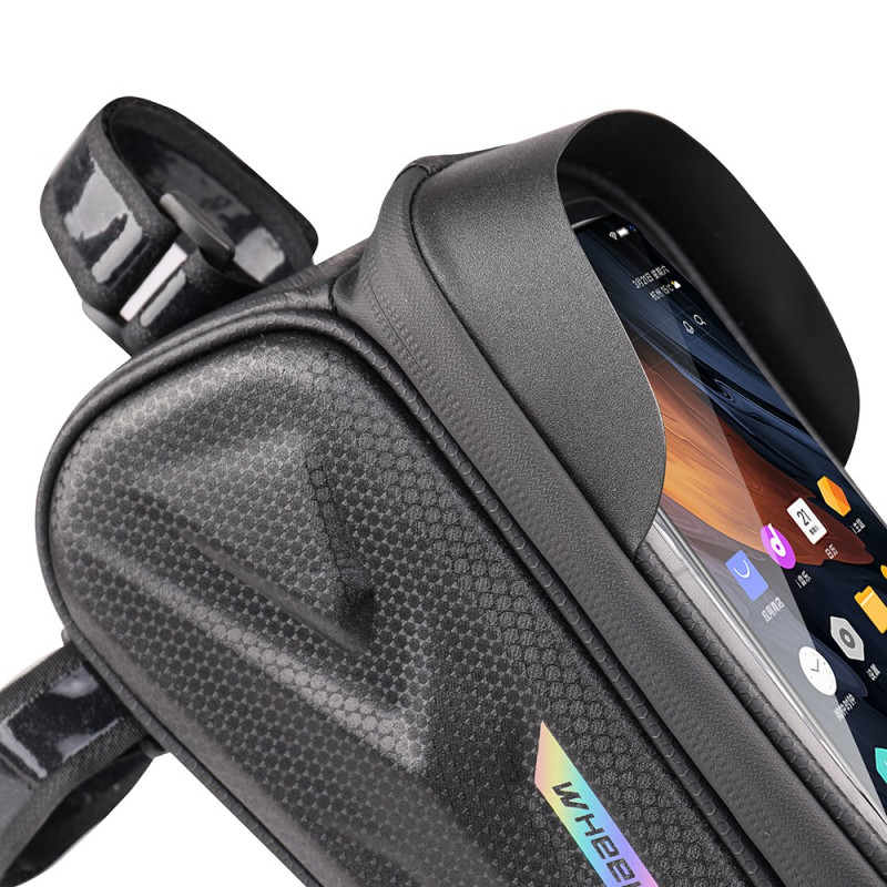 Combining a modern 'carbon fibre' aesthetic with impact protection is the promise of this frame bag. Its rigid EVA case design protects your devices from impact, while the carbon grain coating gives it a refined style. Waterproofing is enhanced by a water-resistant zip. The integrated reflective strip enhances passive safety at night. The sun visor improves visibility of the touchscreen (up to 7 inches) in direct sunlight. It's quick to install, requiring no tools.