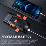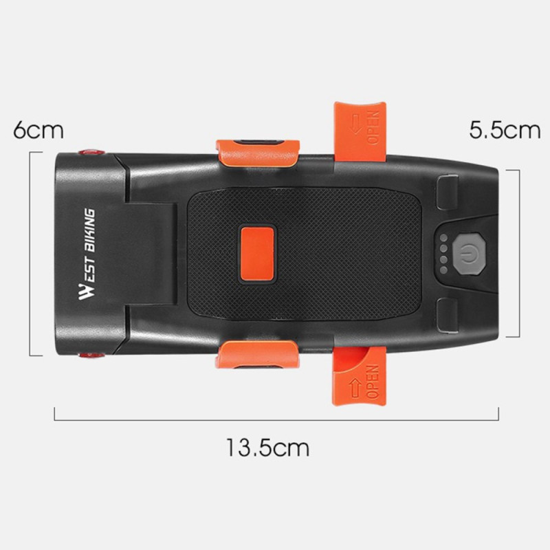 The synergistic integration of five essential functions in a single accessory redefines safety and utility on the handlebar. This WEST BIKING 5-in-1 holder combines a high-brightness LED light, a horn, a secure phone holder, an External Battery (3000mAh) and a warning light. The water-resistant ABS body is fitted with anti-shock rubber pads to protect the phone. The built-in 3000mAh battery guarantees long lighting autonomy and can recharge your smartphone. Its compact size makes for easy installation and safe night-time driving.