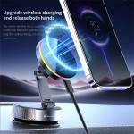 Magnetic wireless car charger holder with 360° panoramic rotation, 15W fast charge and powerful suction cup. Compatible with iPhone 12-17 and Android. Easy installation, secure fixing and durable construction for when you're on the move.