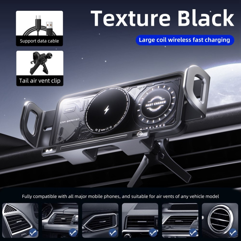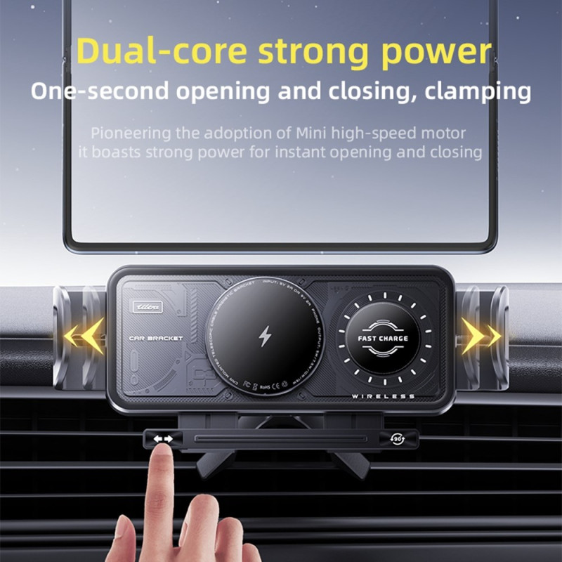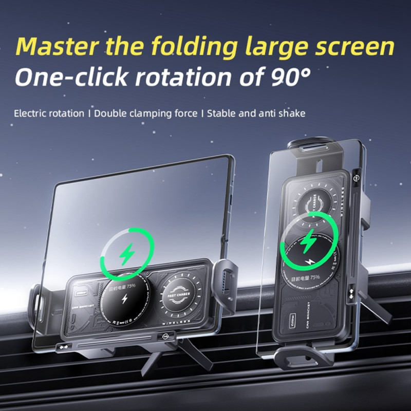 Discover the SD04 car mount with 15W wireless charger. Designed for foldable and classic smartphones, it features 360° electric rotation, an automatic release function and easy installation on a ventilation grille...