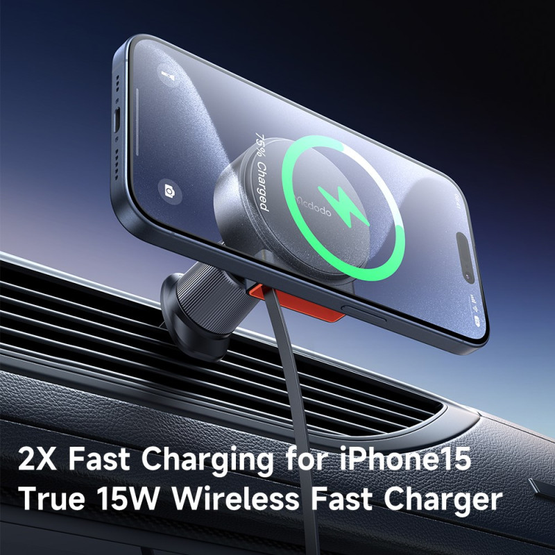 15W magnetic wireless charger with built-in 1m retractable USB-C cable. Compatible with iPhone 12-15 and Samsung. Double magnetic coil for stable attachment to air vents. 15W fast charge with full protection and CE, FCC and other certifications...