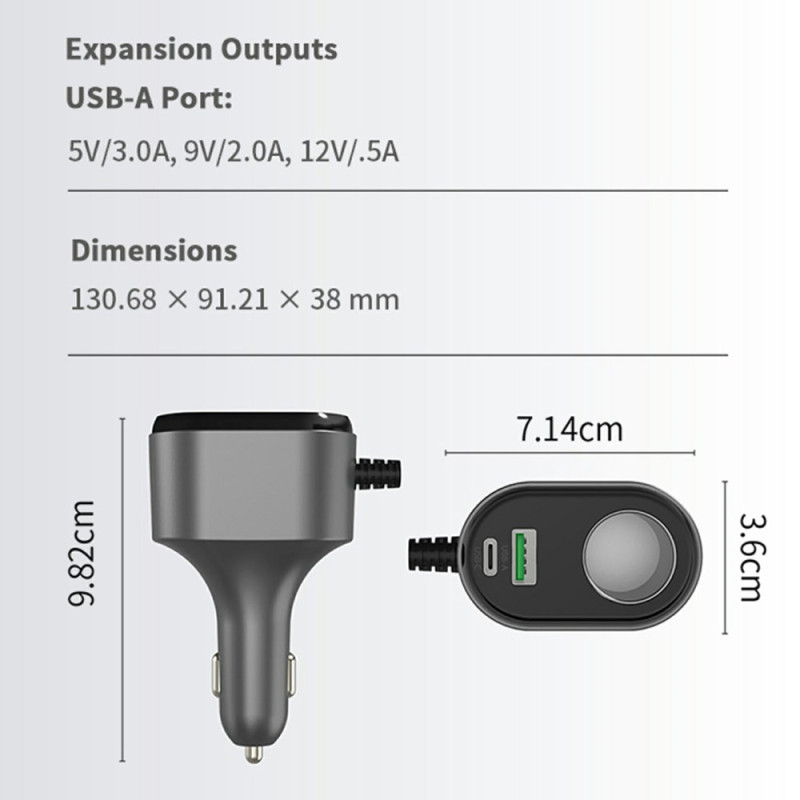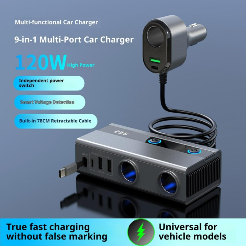 9-in-1 120W multi-port car charger with 78cm retractable cable and 65W PD fast charge. Dual switches for precise power control. Compatible with all 12V-24V vehicles.