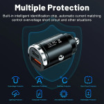 Ultra-fast 30W car charger with dual USB port and Type-C PD. Take advantage of QC3.0 technology for express charging of your devices. Compact design with handy removal ring and smart chip.