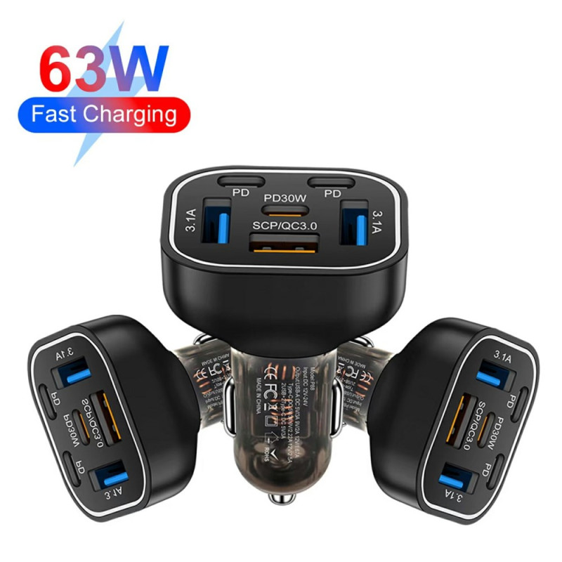 Charge up to 6 devices simultaneously with this compact 63W car charger. With 3 USB and 3 PD Type-C ports, it offers fast, efficient charging while protecting your devices. Its stylish design with 7-colour LED adds a unique touch.