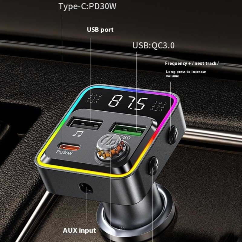 Intelligent 48W car charger with dual quick charge ports (PD30W + QC3.0), integrated MP3 player and 7-colour ambient lighting. Enjoy hands-free Bluetooth calls and optimal charging for all your devices. 12V-24V compatible.