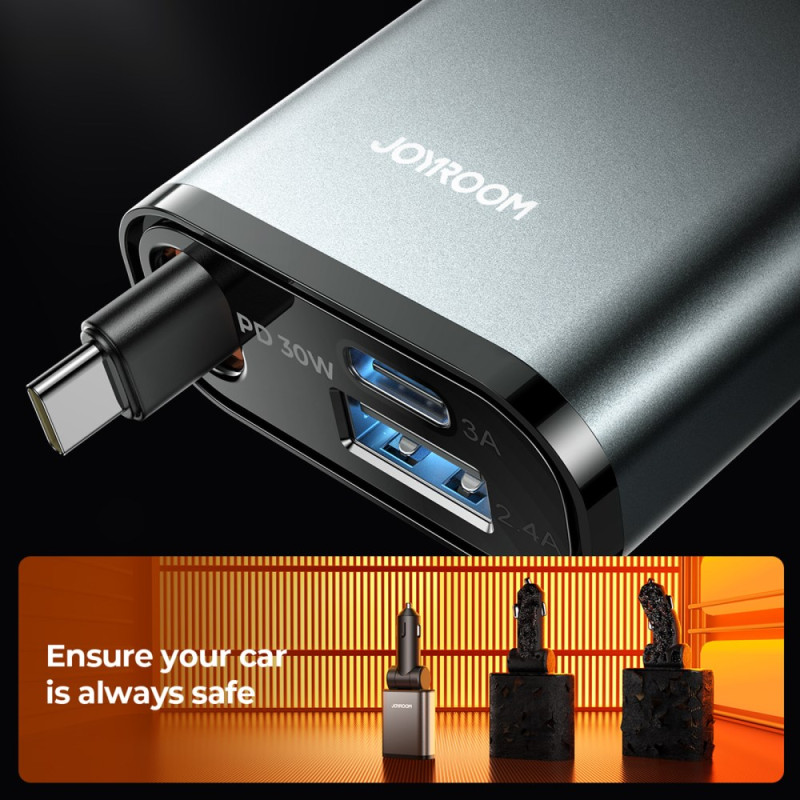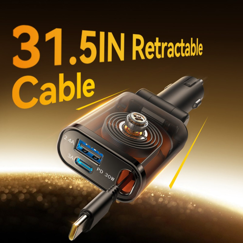 Ultra-powerful 45W car charger with built-in 80cm retractable Type-C cable. Charge up to 3 devices simultaneously thanks to the additional USB-C and USB-A ports. Compatible with all fast charging protocols (PD3.0, QC4, PPS). Compact, portable design...