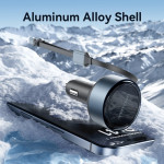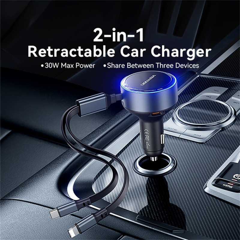 Charge your devices in a flash with this innovative car charger featuring 30W Power Delivery technology. With its two integrated Type-C and iP cables, there's no need to carry extra cables. Take advantage of a total power output of 60W to power several devices simultaneously.