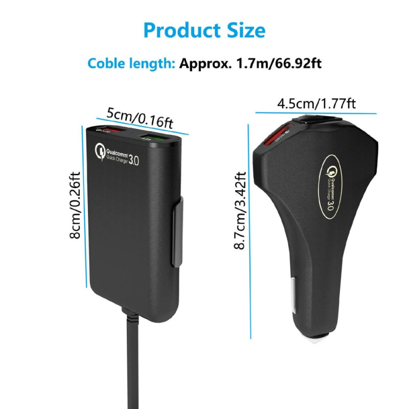 High-performance car charger with Qualcomm Quick Charge 3.0 technology and 4 USB ports. Charge up to 4 devices simultaneously at 4 times the speed of standard chargers. Extra-long 1.7m cable included for easy access by rear-seat passengers.