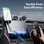 ESSAGER 45W car charger with PD and QC fast charging technology. Dual USB-A and Type-C ports for simultaneous charging of two devices. Ultra-compact design (10g) with smart chip for optimal and secure charging. Compatible with all 12-24V vehicles.