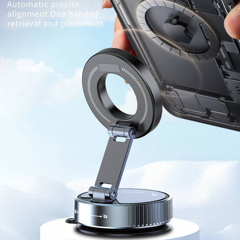 Universal magnetic car mount with ultra-adherent suction cup and 360° rotation. Enjoy optimum navigation thanks to its adjustable arm and powerful 20N magnetic attraction. Easy installation without tools, compatible with all smartphones equipped with magnetic wireless charging.