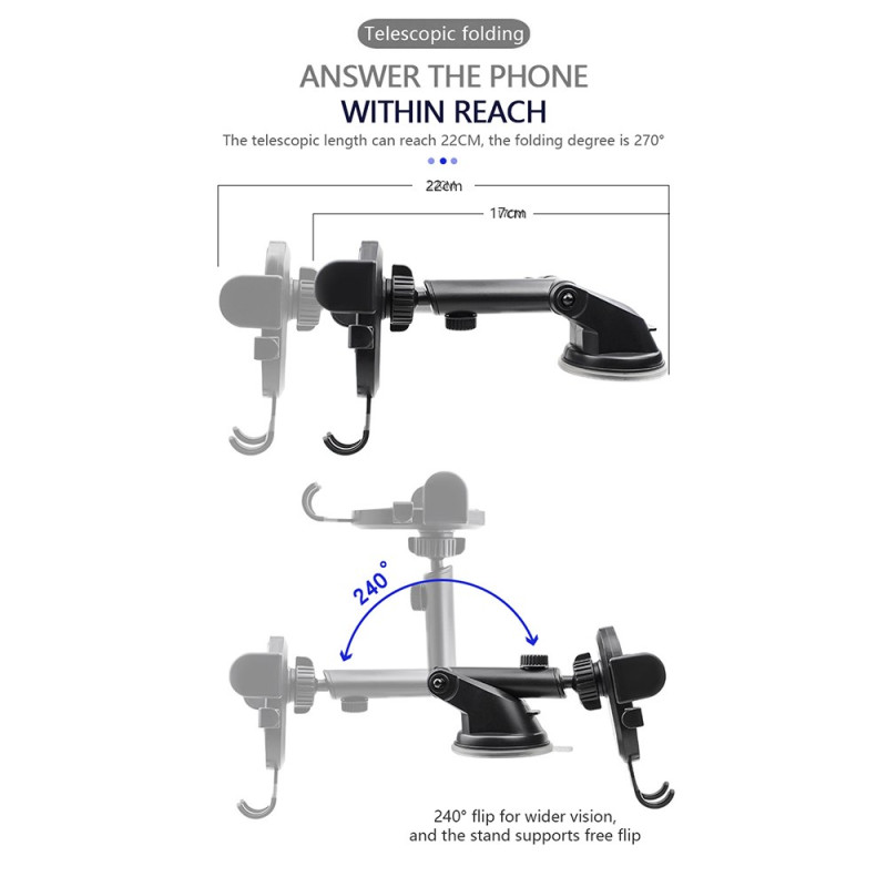 Universal car phone holder with automatic gravity locking system. Suction cup fixing on windscreen or dashboard. Stable triangular structure, 360° rotation, adjustable telescopic arm. Compatible with smartphones from 64mm to 91mm.