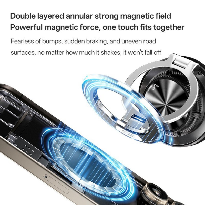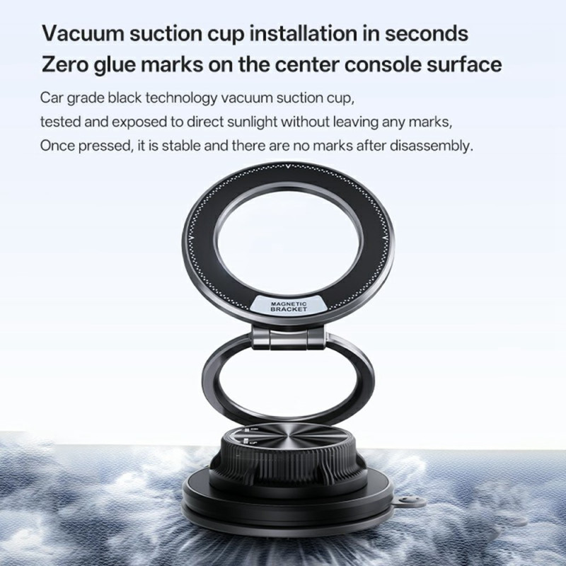 Thanks to its tungsten steel hinge, the angle adjustment is precise, durable and adaptable to all vehicle surfaces. This ESSAGER mount is made from a premium zinc alloy, offering superior structural strength. It uses a dual fixing method: a powerful suction cup and Neodymium N52 magnets for an ultra-secure hold on the dashboard. Maximum flexibility is provided by 360° rotation, 210° folding and 180° tilting. Its foldable, ultra-slim design makes it easy to store when not in use.