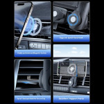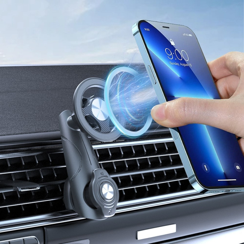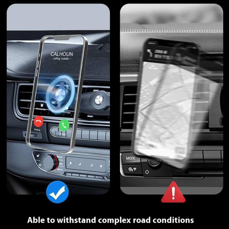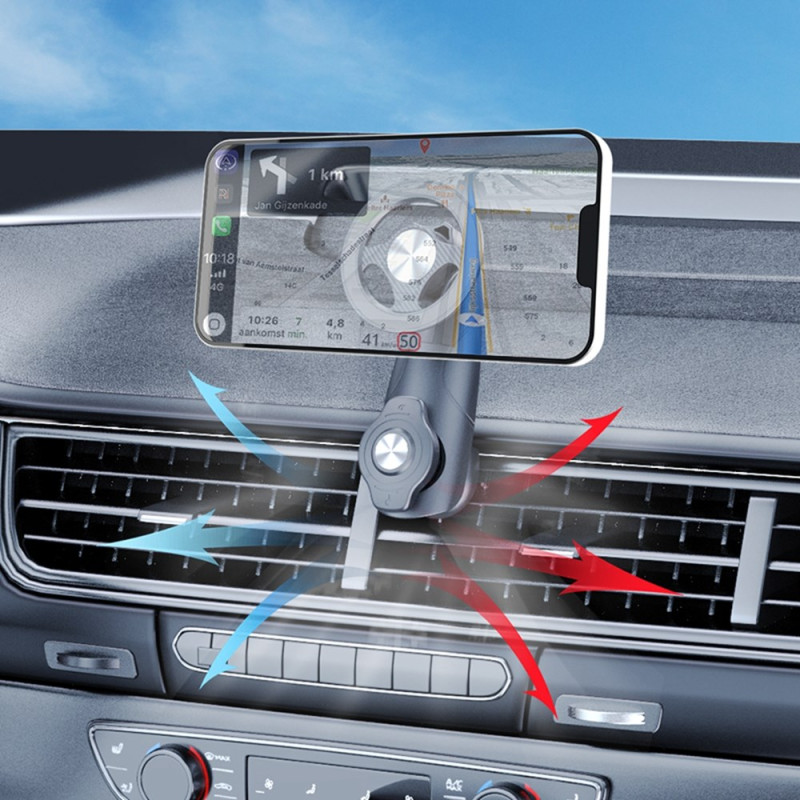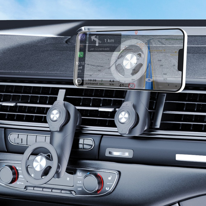 Immediate access to your device is guaranteed by the magnetic force, while the hook ensures stable attachment to the grille. This bracket uses powerful magnets for a secure hold and allows easy one-handed operation. Its extended arm offers flexibility for precise adjustment of the viewing angle. The rear mount, with its robust hook, attaches firmly to the ventilation fins, providing extra stability even on bumpy roads. The silicone coating protects the phone and prevents it from slipping.