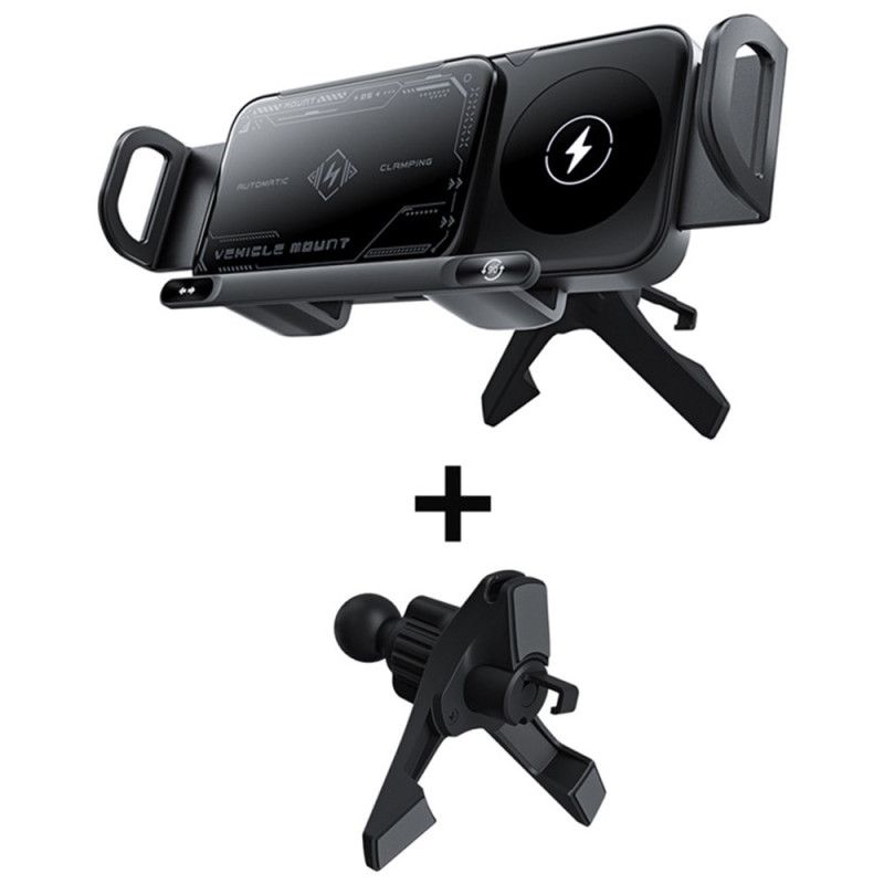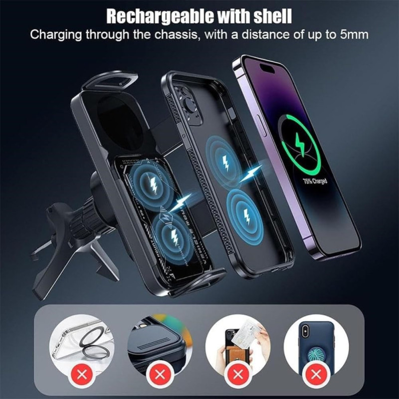 This car phone holder with 15W wireless charger combines comfort, power and safety for your daily journeys. Thanks to its fast charge function, your phone will be fully autonomous without the need for a bulky cable. Its self-rotating system makes it easy to adjust the phone to portrait or landscape mode for optimum navigation. The ventilation grid attachment ensures perfect stability, even on uneven roads. Designed to accommodate a wide range of phones and tablets, it offers a firm hold and a hands-free experience that's ideal for driving in complete peace of mind.