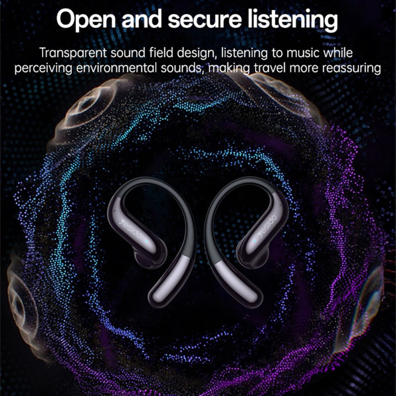 The YESIDO YSP28 earphones feature an open design that combines professional and sports use, offering comfortable listening without insertion into the ear. ENC noise reduction, provided by a unique microphone, ensures clearer calls by limiting surrounding sounds. The 12 mm titanium diaphragm driver delivers precise HiFi sound. The shape-memory hooks adapt naturally to the user's body shape. Battery life is up to six hours, complemented by a 450 mAh charging case, while the high-end finish enhances the product's durability and aesthetics.