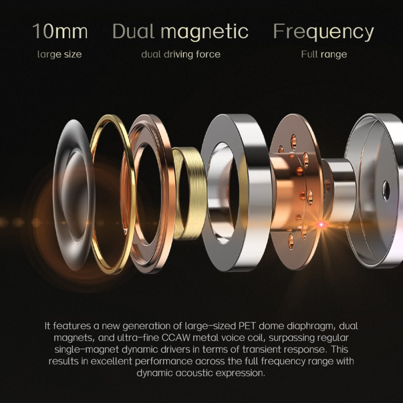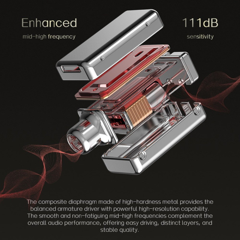 The ND Nice earphones combine a dynamic driver with a large diaphragm and a balanced armature driver to cover a wide bandwidth while delivering accurate, expressive sound reproduction. Their 3D-printed acoustic chamber optimises internal flows for stable, full and detailed sound reproduction. The acoustic adjustment favours vocal clarity, providing warm, balanced listening. The zinc alloy faceplate, moulded and mirror-finished, is robust and aesthetically pleasing. The 2-pin 0.75 mm interface makes it easy to replace the cable or upgrade to a Bluetooth module.