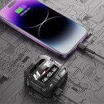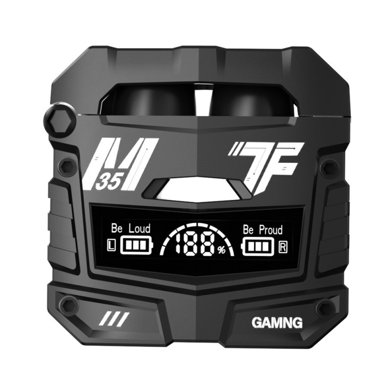 These wireless headphones combine 360° panoramic sound with precise adjustment of all three frequencies to deliver a balanced listening experience, with bright highs, clear mids and rich bass. Their Bluetooth 5.3 chip guarantees a stable connection, low latency and a range of up to 10 metres, ideal for gaming and video. The digital LED display makes it easy to check the battery level of both the headphones and the casing. The water-resistant structure withstands everyday sports use. The high-capacity case also doubles as an external battery for recharging a phone, ensuring comfortable autonomy on the move.
