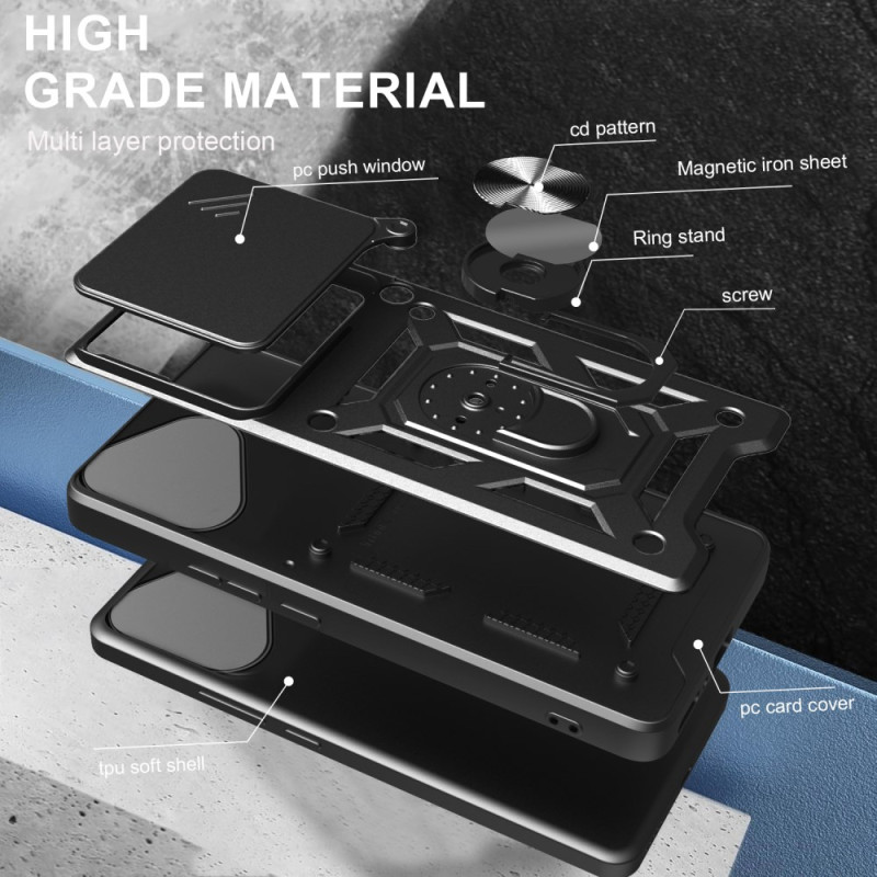 Discover our innovative case for the Honor 400 Lite, combining protection and functionality. Made from TPU and plastic, it offers military-grade shock resistance, a practical rotating support and a sliding cover to protect the lens.