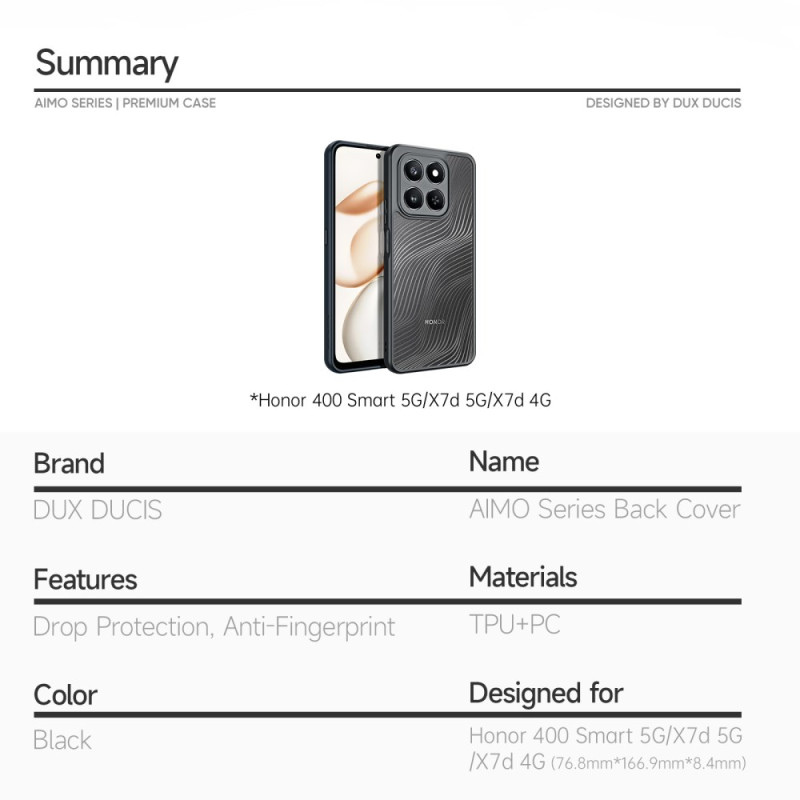 Discover the DUX DUCIS Aimo Series case for Honor 400 Smart 5G / 4G, combining style and protection. Made from PC and TPU, it offers a comfortable grip, aesthetic lines and reliable lens protection. Compatible with screen protectors, it provides optimum protection against drops and bumps.