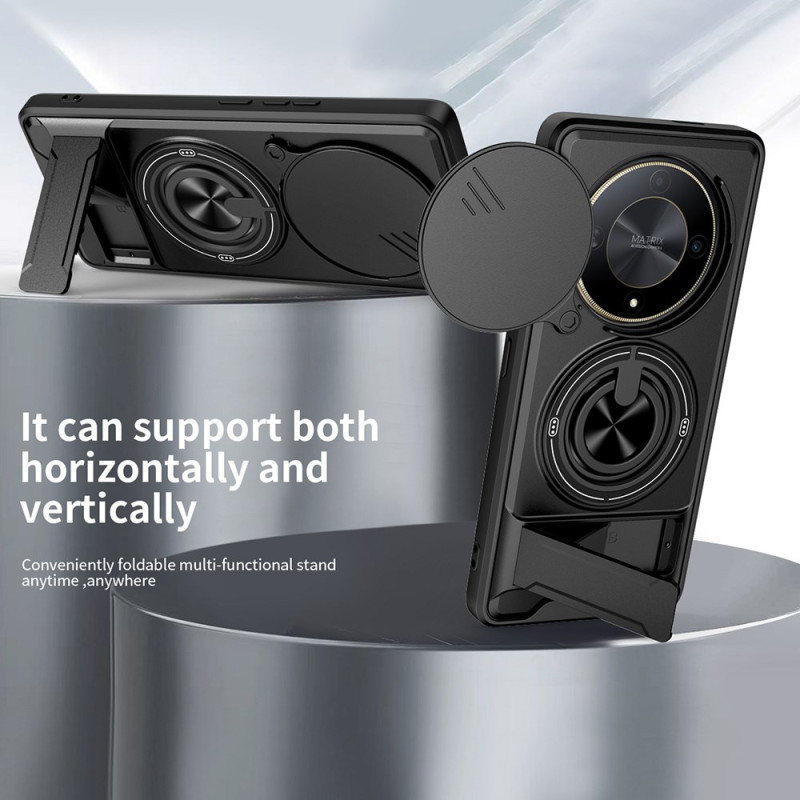 Maximum protection for your Honor with this innovative magnetic case. Impact-resistant double layer, 360° rotating ring, integrated foldable holder and sliding camera cover. Compatible with magnetic car mounts.