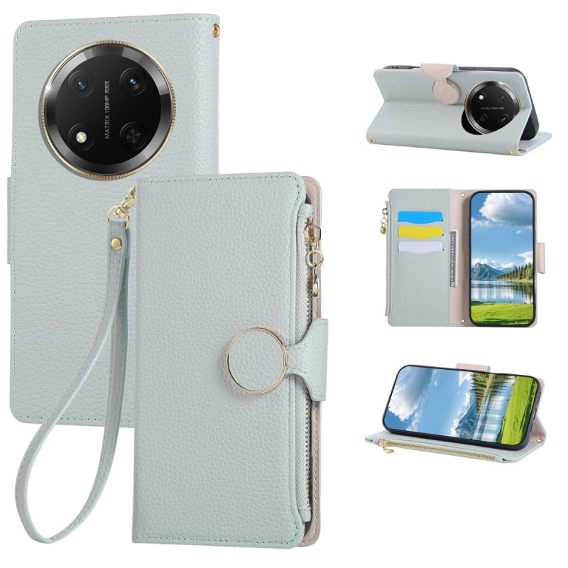 Multifunction wallet case with zip for Honor Magic 7 Lite / X9c. Elegant design in PU leather with shockproof TPU case , 3 card slots, side zip pocket and detachable hand strap. Integrated stand function.