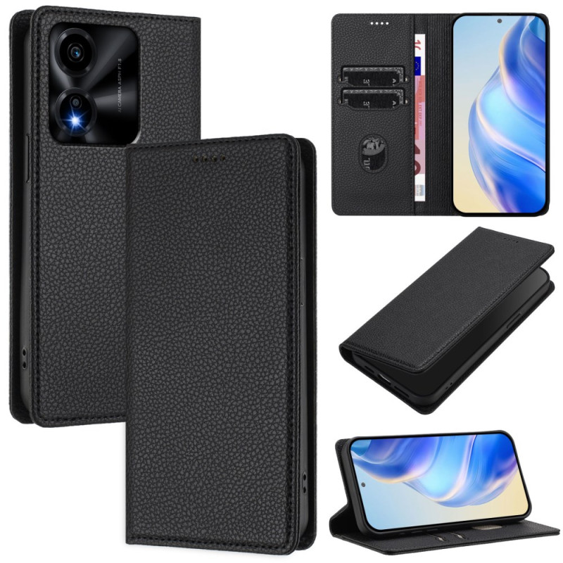 Discover our stylish and functional wallet cover for the Honor X5c Plus. Made from textured PU leather and TPU, it offers RFID protection, practical storage for cards and notes, and an adjustable stand function. Compatible with wireless charging, this case combines security and practicality for your smartphone.