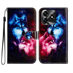 Elegant wallet case with printed wolf motif for Honor X5c Plus 4G. Refined, functional design with integrated stand, 3 card slots, secure magnetic closure and detachable hand strap.