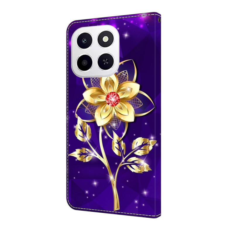 Protect your Honor X6c in style with this wallet case featuring a gold floral motif on a purple background. With 2 card slots, a note compartment and a practical fold-out holder, it combines style and functionality.