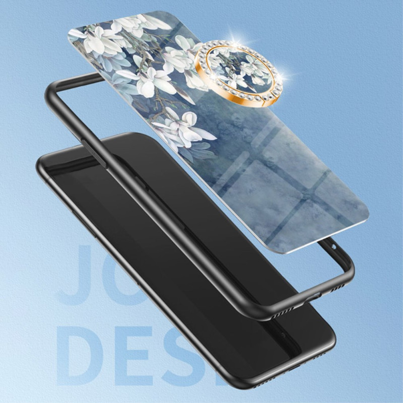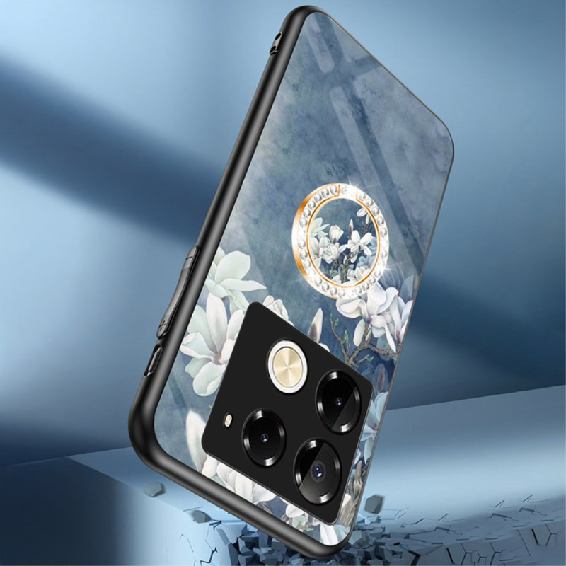 Protect your Infinix Note 40 Pro 4G with this elegant case featuring floral motifs. It features a foldable support ring with rhinestones, a tough tempered glass back and an integrated metal plate for magnetic support.