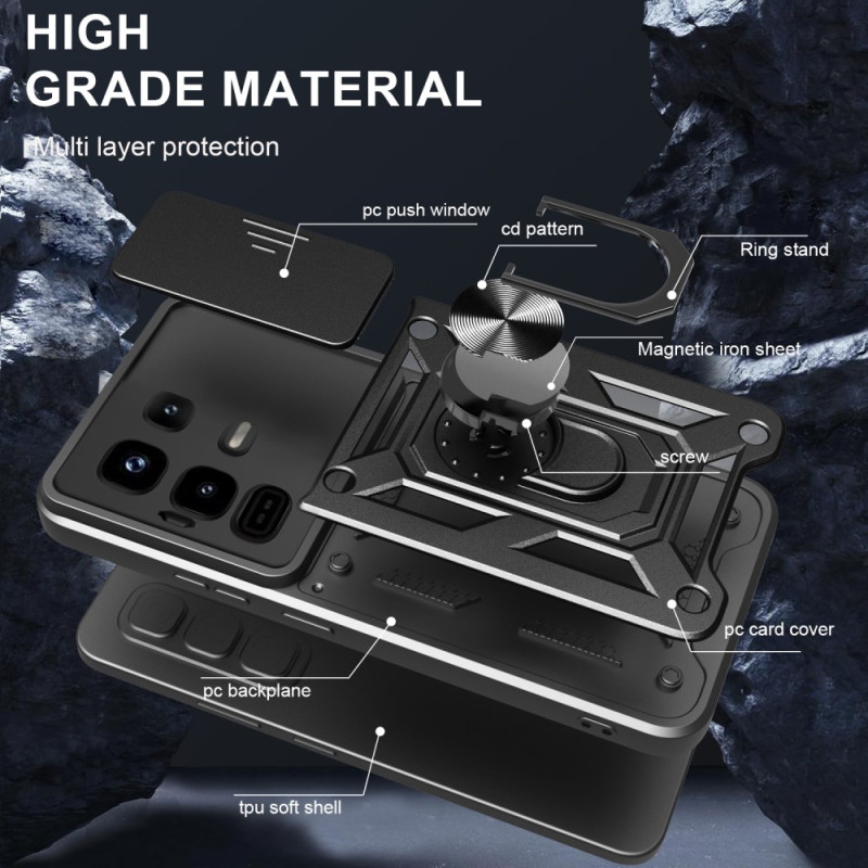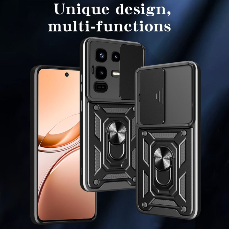 Protect your Infinix Note 50 Pro 4G with this multifunction case featuring a sliding camera protection, a 360° rotating kickstand and an integrated magnetic plate. Robust design offering military-grade impact protection.