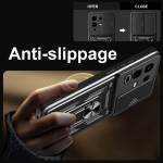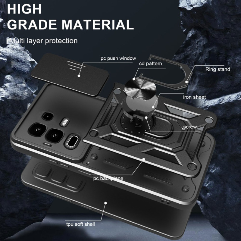 Protect your Infinix Note 50s 5G with this rugged case featuring innovative sliding camera protection, an integrated rotating mount and military-grade impact resistance. Compatible with magnetic car mounts.
