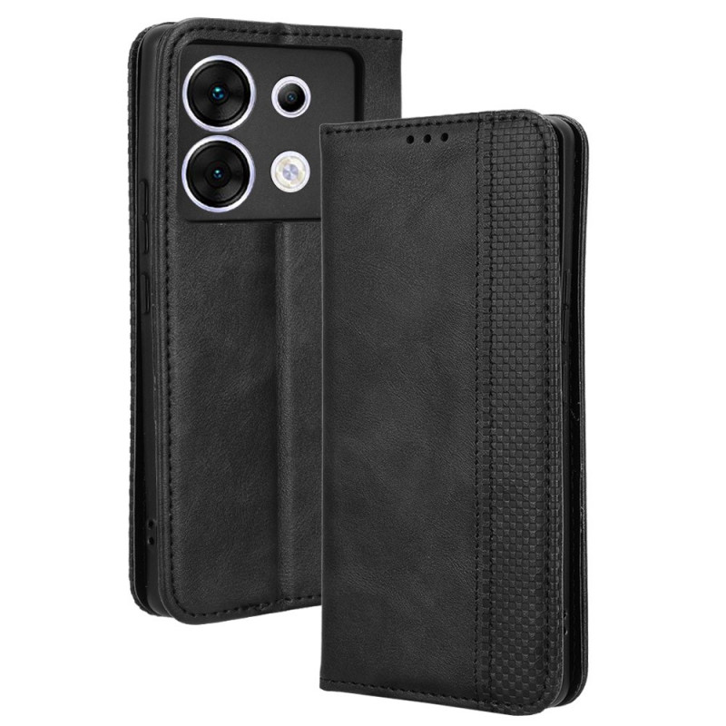 Elegant wallet case in retro PU leather for Infinix Zero 30 5G. Refined design with engraved mosaic border, integrated card holder and adjustable stand. Automatic magnetic closure for complete protection and practical everyday use.