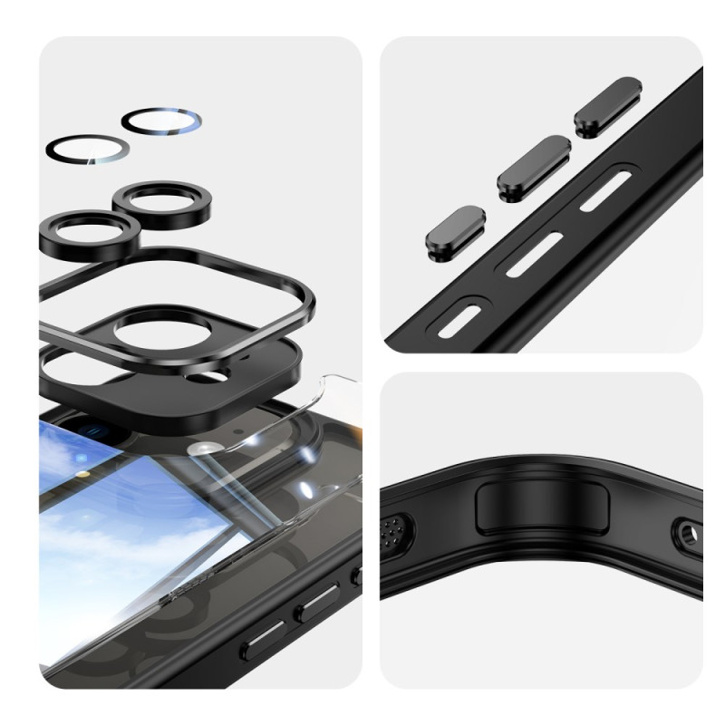 Discover our full protective case for iPhone 12. Combining a clear TPU case and tempered glass film, it offers maximum protection against bumps and scratches. With its air-cushioned anti-drop design, independent metal buttons and integrated lens protection, this case combines safety with functionality.